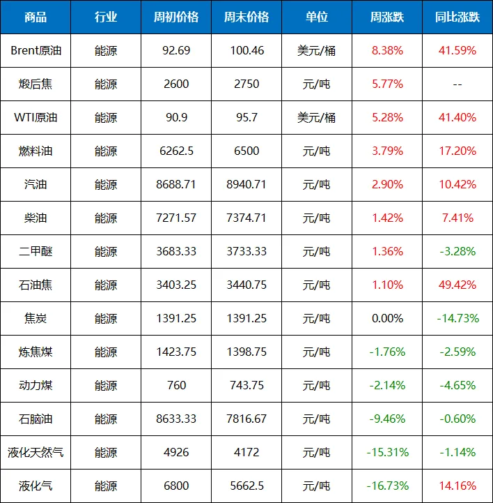 2026年(3.9-3.13)能源大宗商品价格涨跌榜