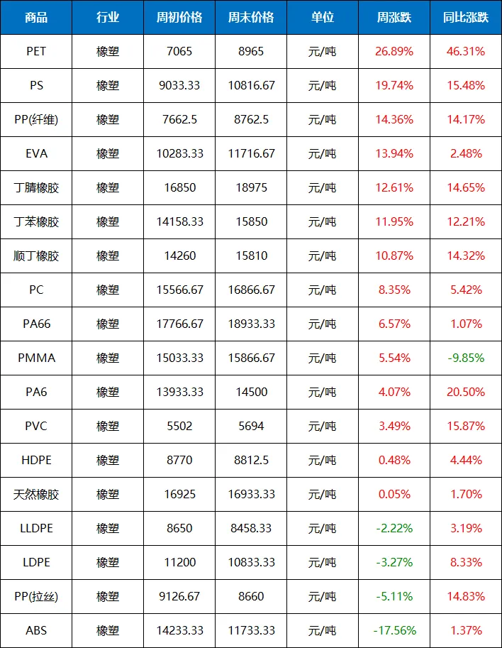 2026年(3.9-3.13)橡塑大宗商品价格涨跌榜