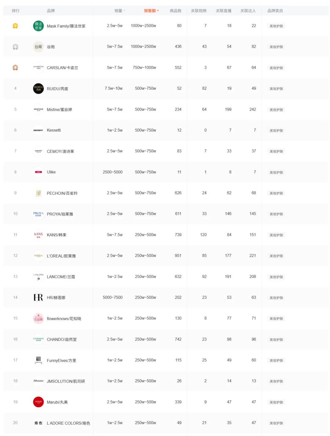 2026年3月12日抖音美妆护肤品牌销售排行榜TOP20