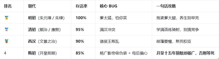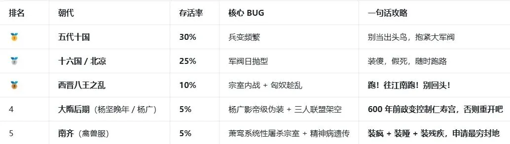 这份指南覆盖秦到清所有主要朝代/时期,严格按存活率降序排列,建议收藏,万一哪天用得上呢?