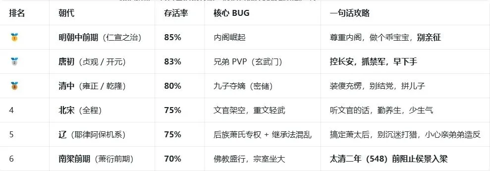 ✅ 存活率定义:被立为储君后善终(自然老死 / 病死算存活,被杀 / 赐死 / 政变死算死亡),继位后非自然死亡也不算存活