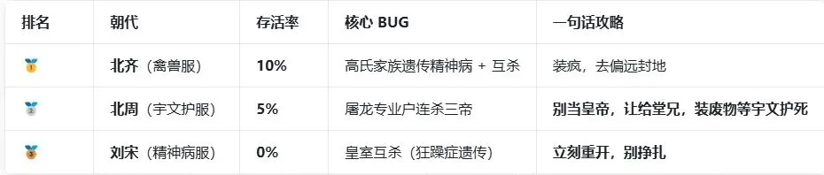 💡 北周真相:宇文护 15 年连杀三帝,宇文邕能活,全靠 “装废” 演技拉满。💡 刘宋说明:0% 为夸张表达,实际存活率≤10%,皇室互杀率历史第一。