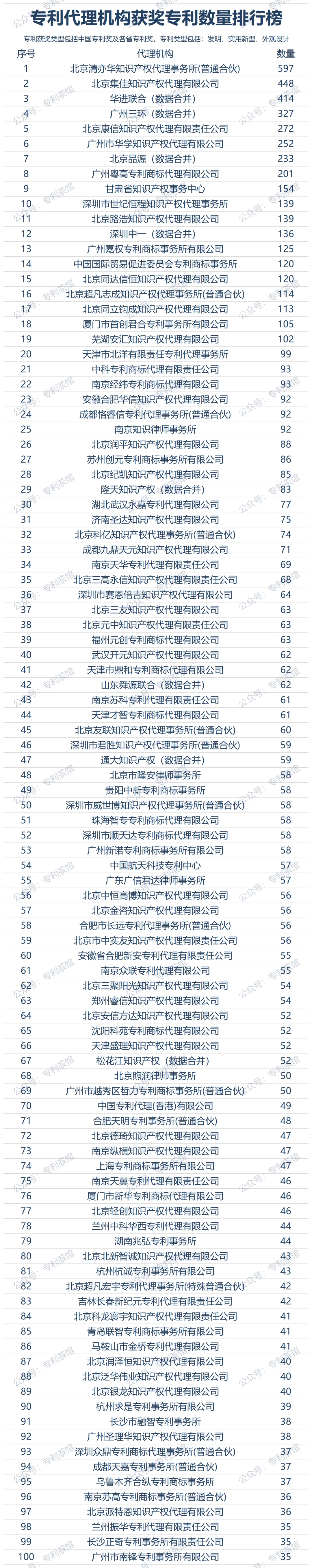 统计代理机构中国专利(发明、实用新型、外观设计)的获奖专利(发明、实用新型、外观设计),总计19229件,其中获奖专利前100代理机总计8679件,占总量的45%: