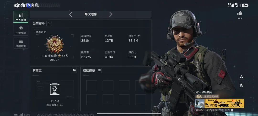 一只热爱三角洲的鼠鼠玩家,上可绝航猛攻下可机坝跑刀,希望在此能遇到有趣的你,游戏id:少年毛不易 希望能认识更多的朋友!