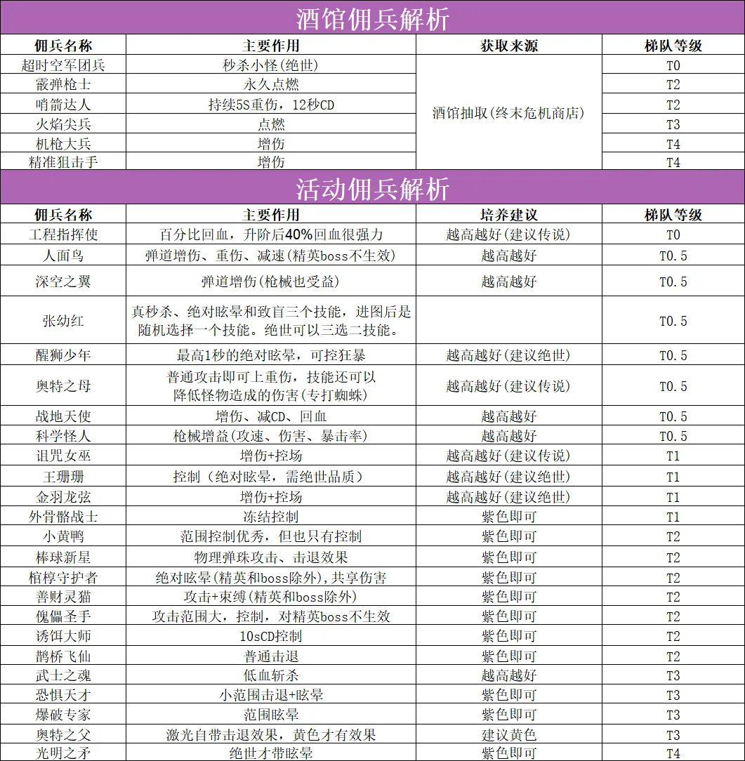总结:本期佣兵排行,是个人理解和游戏体验给出的总结,如果有不同意见的小伙伴,可以评论区讨论给出不同建议!