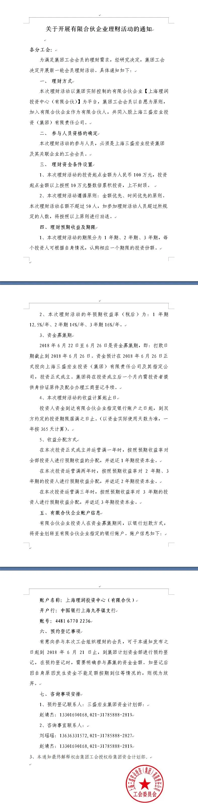 该通知指出,这次理财活动的投资起点金额为人民币100万元,名额不超过50人,参与人员必须是三盛宏业及其关联企业的工会会员。其资金募集期为2018年6月22日至2018年6月26日。