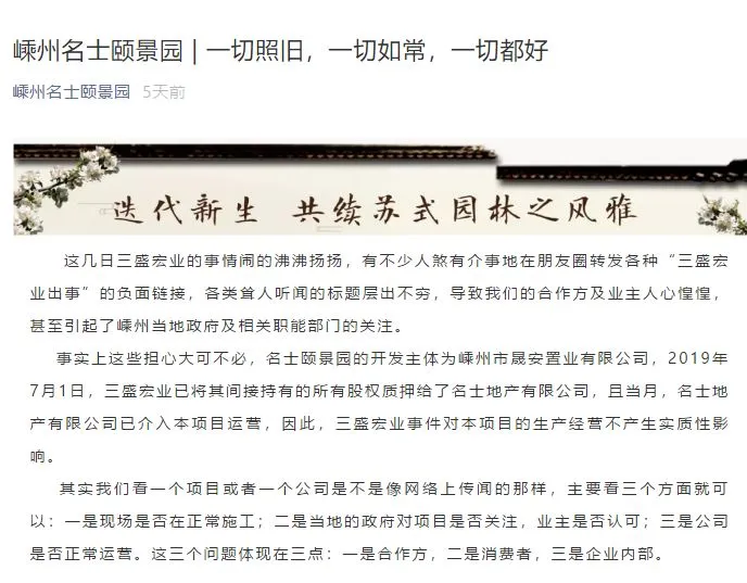 嵊州名士颐景园也在公众号上表示,名士颐景园的开发主体为嵊州市晟安置业有限公司。2019年7月1日,三盛宏业已将其间接持有的所有股权质押给了名士地产有限公司,且当月,名士地产有限公司已介入本项目运营,因此,三盛宏业事件对本项目的生产经营不产生实质性影响。
