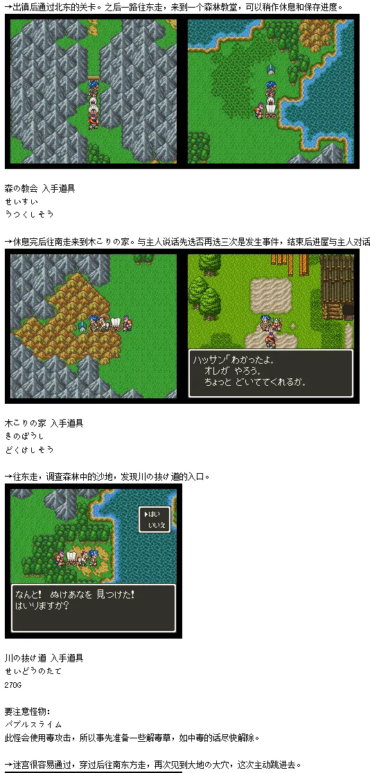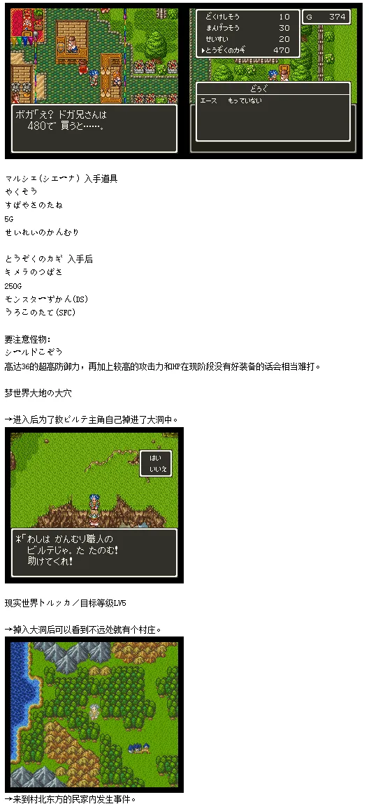 提示:反复与村中西、东面的ドガ和ボガ对话,这样一来民艺品最高可以卖到480G,卖不卖都对流程没有任何影响。村中还可以买到せかいちず(世界地图)和盗賊の鍵(盗贼钥匙),地图可以从2000G还价到200G,盗贼钥匙可以在村右下角商人处花470G买到。在大地图时候按R键便可打开地图。