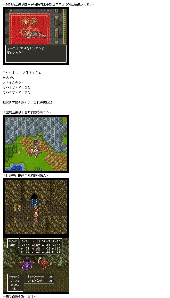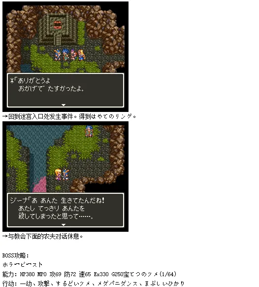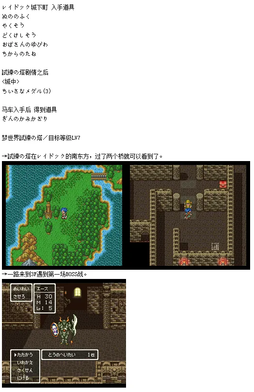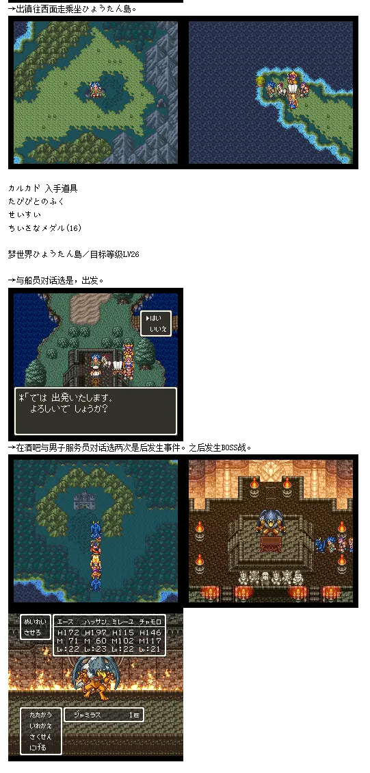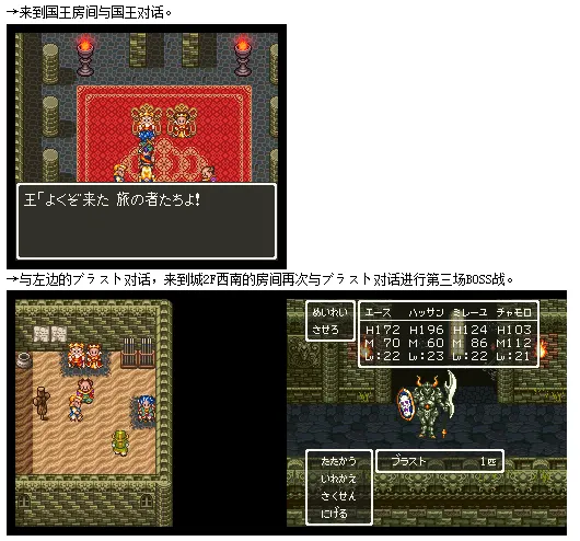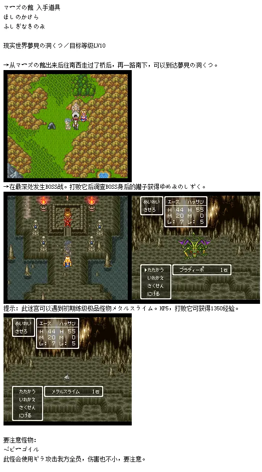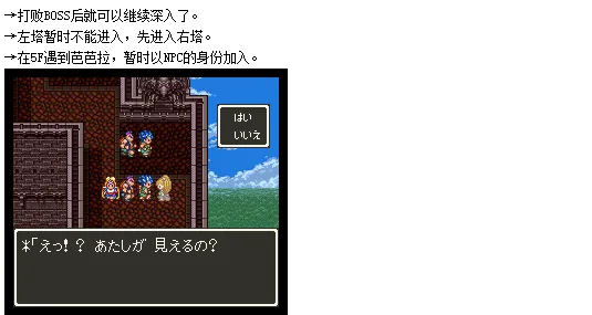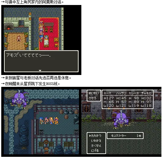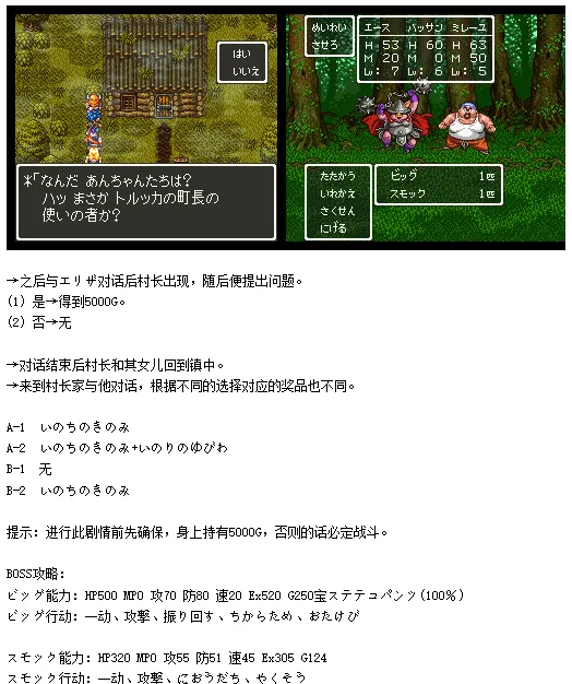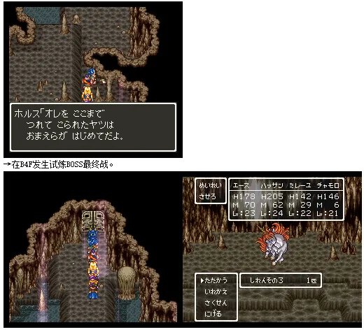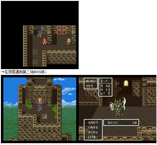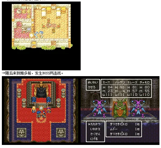 如果在这里已经LV7的话这一战很轻松,对BOSS使用ルカニ(降低防御力)然后猛攻即可,要注意身上带几片药草。如果低等级的话要注意BOSS的ちからため这招,下一回防御可避免受到大伤害。