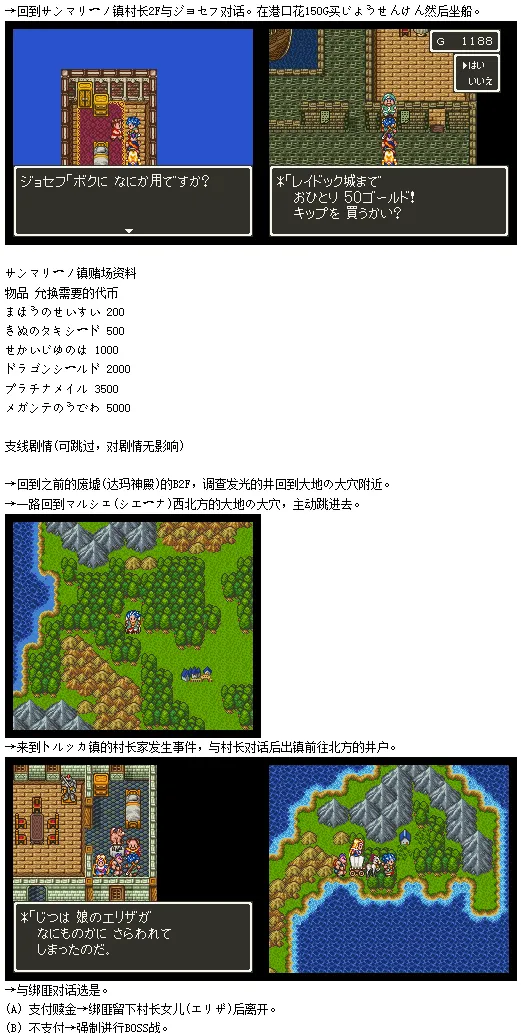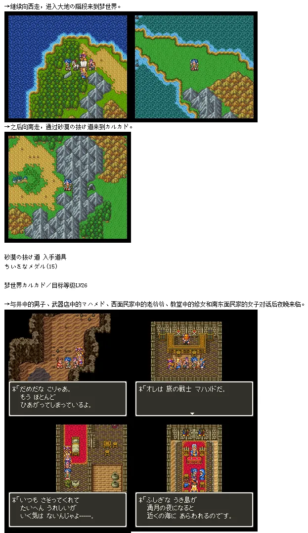 →与老爷爷对话继续乘坐ひょうたん島,与柜台的商人对话休息,回到カルカド。
