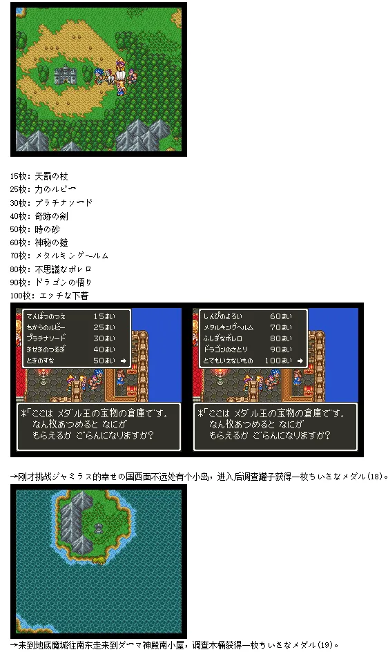 →梦世界マルシェ的西面(之前大地の大穴的位置)可以发现メダル王の城。之前在各地收集的ちいさなメダル可以到这里来换贵重的道具和武器。
