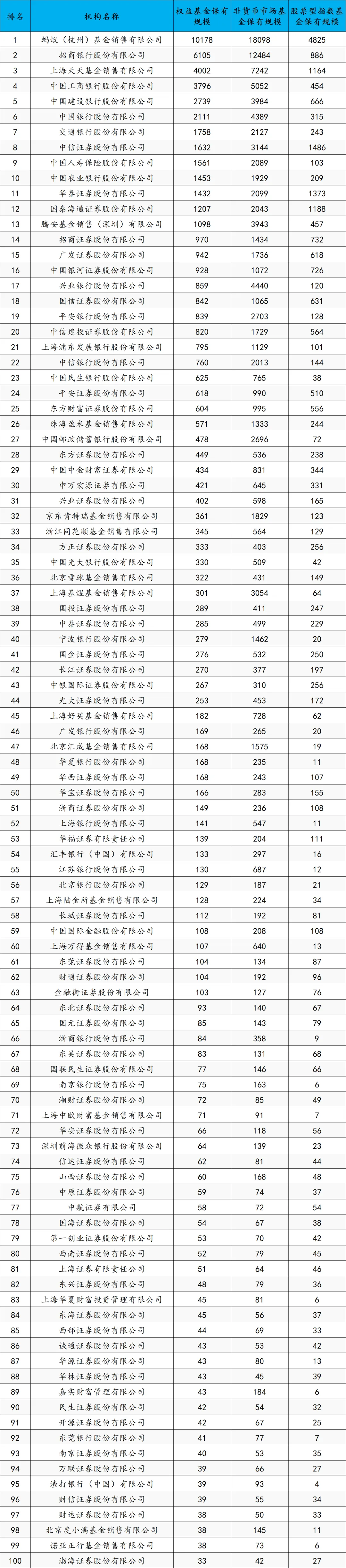 华泰证券、国泰君安、招商证券、广发证券等头部券商均进入前20,券商在权益类产品特别是ETF等指数产品的销售上展现出专业优势。