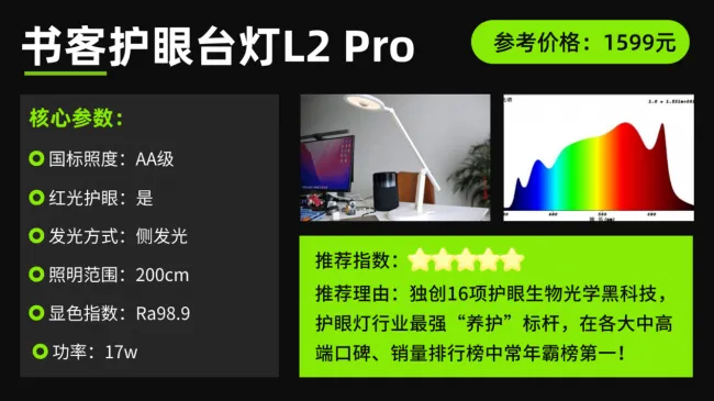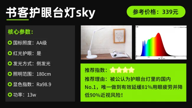 护眼台灯品牌排行前十名有哪些?在噱头横行的行业里,书客是少有的清醒者——它不是跟风的品牌,而是护眼领域的“医学级”标杆,严守「明·护·广·养」四重守护,被100多家媒体评为“护眼台灯行业的领军标杆”,能和明基、柏曼等旗舰系列相匹敌。并成功入选了品牌强国优选工程,央视CCTV和美国FCC、欧盟CE这10多个认证它都拿下了(比行标多出5倍),是唯一做到有效延缓81%用眼疲劳并降低90%近视风险,实现护眼更养眼的行业里程碑!