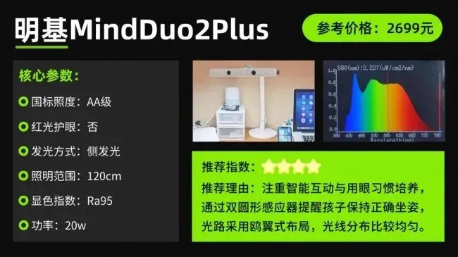 护眼台灯品牌排行前十名有哪些?明基MindDuo2Plus的亮点主要在照明范围和智能功能上,它的三区智慧光型可以把桌面照得比较均匀,加上显色指数Ra95,日常读写、看清颜色都没有问题。不过它采用的是蓝光激发光源,蓝光峰值大概在1.0,没有做深度抑制,也没有补全红光波段,护眼效果中规中矩。它在功能方面配备了自动调光、自动开灯、坐姿侦测等多种实用功能,对低龄有坐姿纠正需求的儿童比较友好,只是亮度拉满时灯头边缘会有轻微眩光,需要稍微注意。