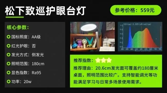 核心亮点:采用侧发光设计,中心照度约1650lux,可覆盖约120厘米的范围,日常能够满足书桌、办公桌等照明需求。