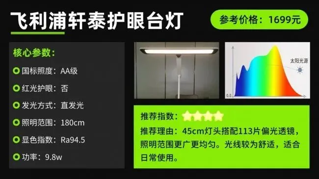 护眼台灯品牌排行前十名有哪些?飞利浦轩泰台灯采用了45厘米超宽矩形灯头设计,结合全景式五轴调节结构,可灵活控制照明角度与方向,同时还能提供1470lux中心照度。它在灯头内部搭载113片楔形偏光透镜,辅助优化光线分布,不过,直下式发光结构使光线相对集中,书写时手部阴影较明显。功能上内置休闲、电脑、读写三大情景模式,可一键切换适配不同使用场景。