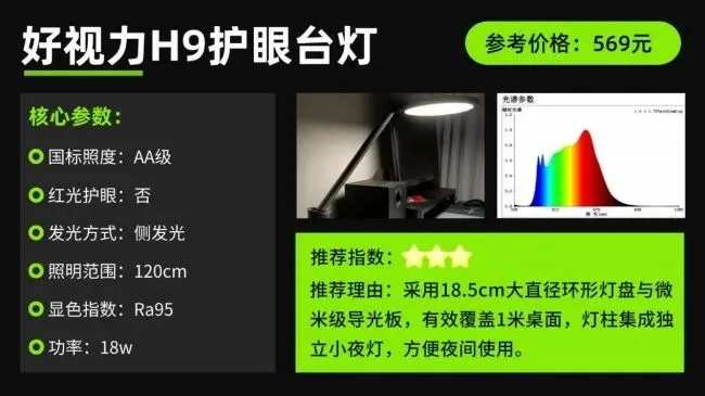 护眼台灯品牌排行前十名有哪些?好视力H9护眼台灯采用侧发光设计,搭配直径18.5cm的光源面,中心照度可达917lux,同时能覆盖约120cm桌面,光线柔和不刺眼,适合日常学习、写作或绘画使用。在外观上,它的灯臂采用双灯轴结构并配合隐藏式转轴设计,既保持简约外观,又能灵活调整光线方向,配合加重底座使用稳定可靠。功能上具备智能调光、番茄定时提醒、延时关灯,以及灯柱侧置小夜灯,操作便捷且贴心。不过它的蓝光峰值偏高,护眼效果有限,光线在强光环境下略有不均。