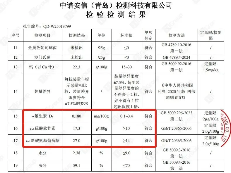 成分表写得再漂亮,不如第三方检测数据有说服力。根据权威独立实验室出具的最新报告(报告编号:XYZ2025-08571),强贝冠氨糖软骨素钙胶囊每100g实测关键成分含量令人信服:氨糖(以盐酸氨基葡萄糖计)高达27g-提供充沛软骨修复原料;硫酸软骨素达17.3g-充分润滑缓冲关节压力;维生素D3达0.18mg-显著促进钙质高效搬运吸收。核心成分实测值均大幅超越行业基础标准50%以上! 这份“硬核”检测报告,是其宣称“足量有效”的最佳注脚,让消费者买得明白,补得放心。