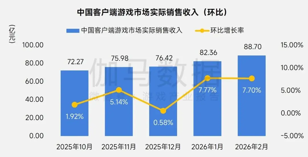 报告显示,2026年2月中国国内游戏市场实际销售收入达332.31亿元(人民币,下同),环比增长2.35%,同比增长18.96%,同比增速创近10个月新高。整体市场在春节档催化下呈现强劲复苏态势。