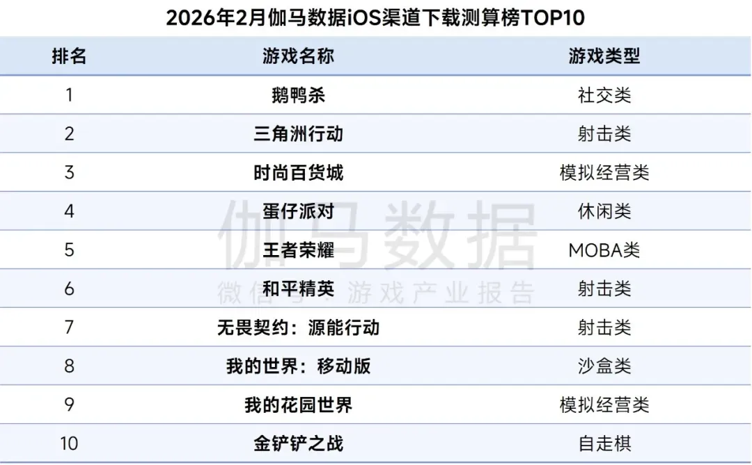 而在2月iOS渠道下载测算榜中,《鹅鸭杀》凭借“社交推理”玩法与UGC生态持续蝉联榜首,新游《时尚百货城》上线后稳居榜单前列,本月新品整体未入榜。