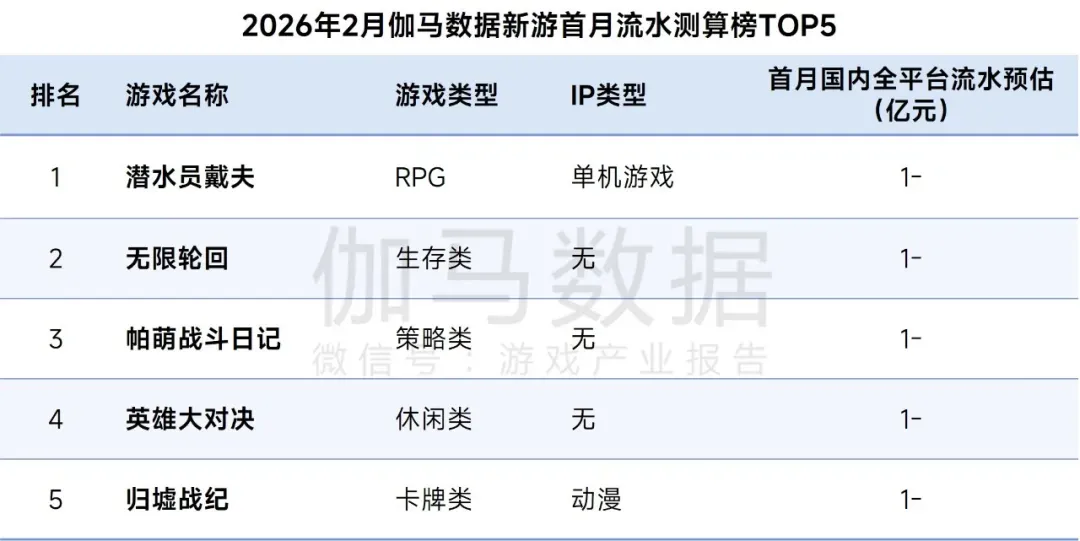 新游方面,2月上线产品整体表现不佳,伽马数据新游首月流水测算榜中,《潜水员戴夫》手游凭借高保真还原端游玩法及DLC内容,位列榜首。