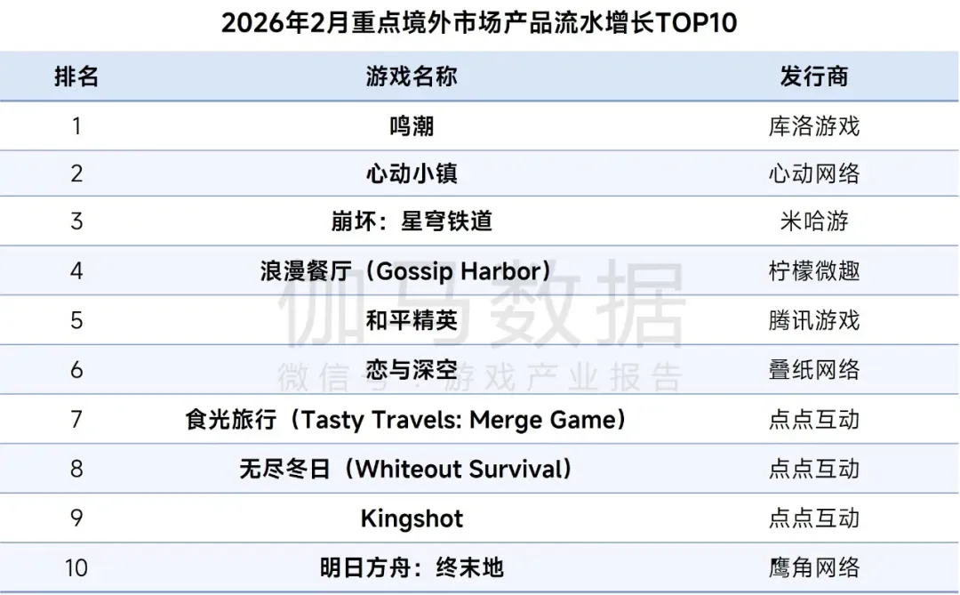 其中,《鸣潮》3.1版本“赠予雪中的你”上线后流水创历史新高;《心动小镇》通过与“小马宝莉”联动及情人节活动拉动增长;《崩坏:星穹铁道》4.0版本“满月是神不在的时间”有效推动老玩家回流与付费。