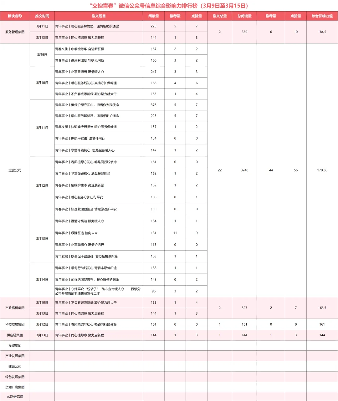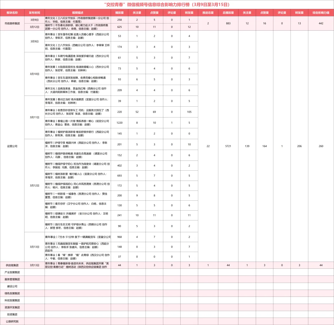 综合影响力值=信息推文量+平均阅读量+在看量+点赞量,上周统计数据值得注意的问题:除服务管理集团、运营公司、市政路桥集团、科技发展集团、供应链集团外,集团公司所属建设公司、产业发展集团、投资集团、公路研究院,绿色发展集团、资源开发集团6个板块信息推送量均为零。综合影响力值=视频推送量+平均播放量+关注量+评论量+转发量+点赞量,上周统计数据值得注意的问题:除市政路桥集团、运营公司、供应链集团外,集团公司所属科技发展集团、产业发展集团、服务管理集团、投资集团、建设公司、绿色发展集团、资源开发集团以及公路研究院8个板块信息推送量均为零。榜单说明: