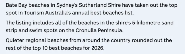 据媒体报道,澳洲旅游局(Tourism Australia)公布了2026年度“澳洲最佳海滩”评选结果!