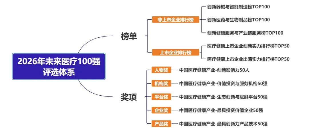 2026未来医疗100强评选锚定 “中国医疗健康产业创新·交易·赋能” 核心方向,实现评选体系的全新升级。本届评选下设两大核心板块:2026未来医疗100强榜单、2026未来医疗100强奖项。