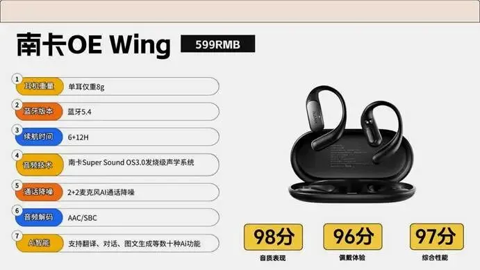 开放式耳机推荐TOP1:南卡OE Wing(599元)推荐指数:⭐⭐⭐⭐⭐