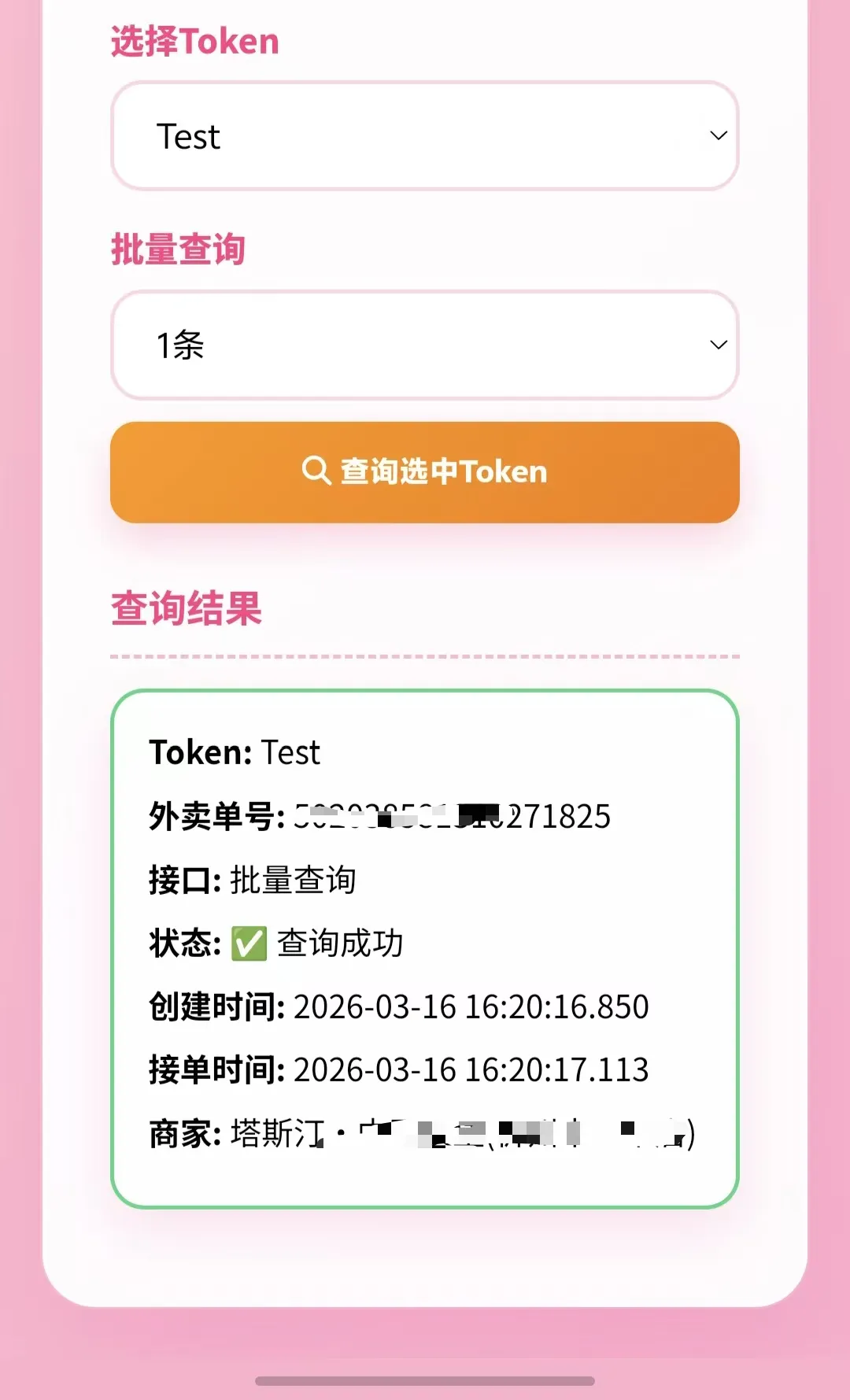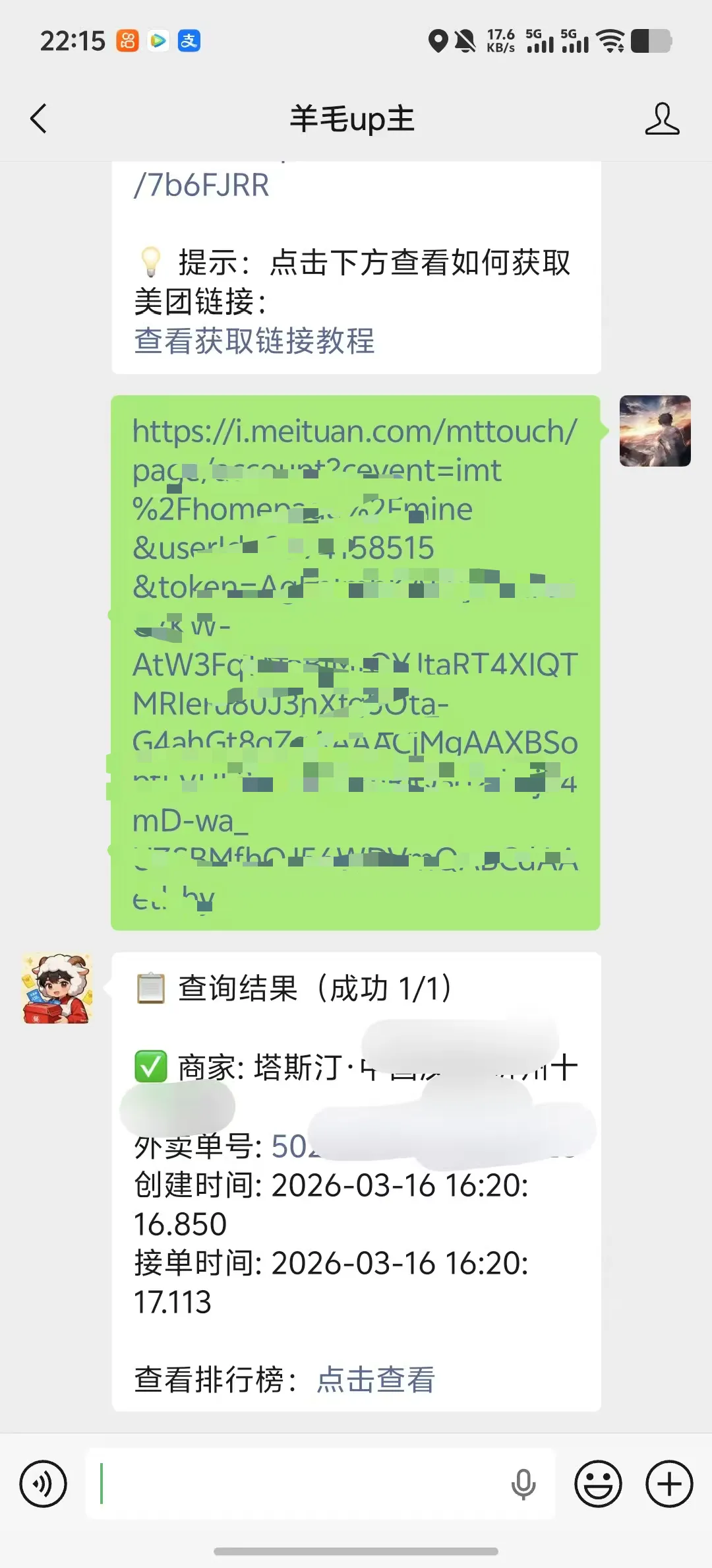 首先公众号回复订单查询,然后复制你的token然后自动查询你下的第一个商家的接单时间,但是也是仅仅是部分商家可以查询。