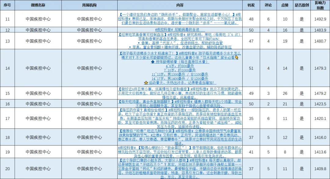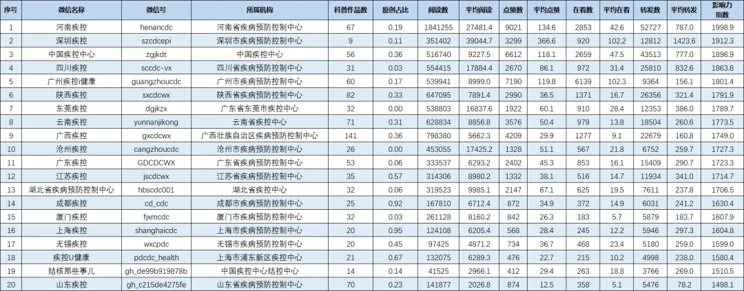 为不断提升疾控体系健康传播水平,充分发挥新媒体传播作用,促进机构间交流学习,更好地服务公众,中国疾控中心每月发布疾控机构两微传播影响力排行榜。