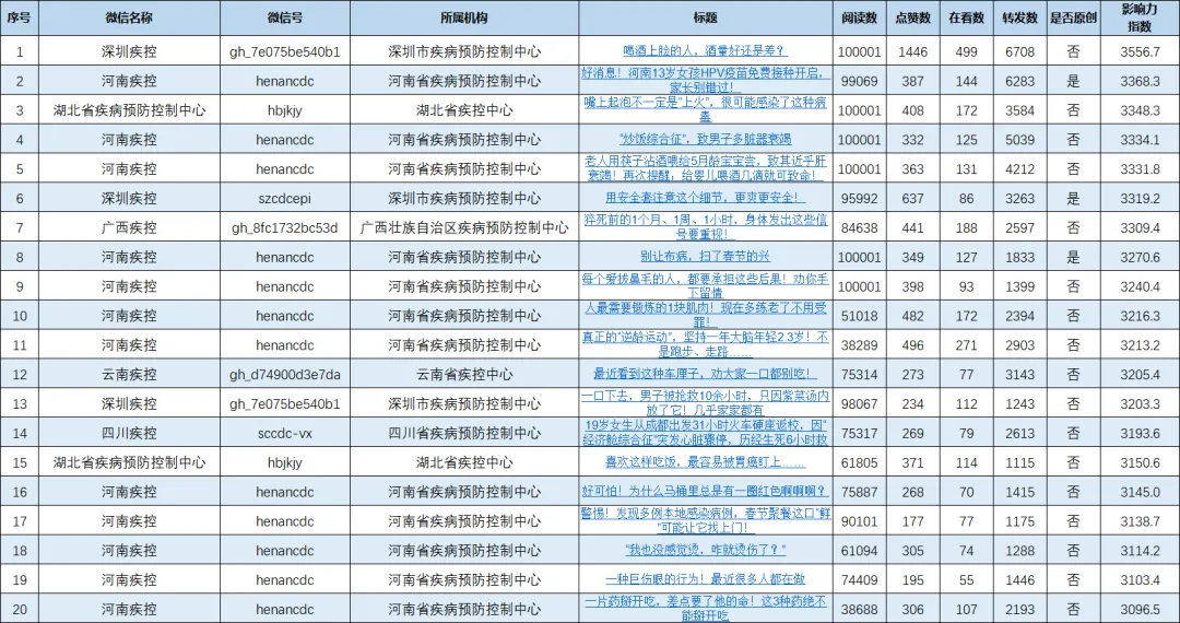 @深圳疾控 发布的文章《喝酒上脸的人,酒量好还是差?》以3556.7的影响力指数位列第一;@河南疾控 发布的文章《好消息!河南13岁女孩HPV疫苗免费接种开启,家长别错过!》以3368.3的影响力指数位列第二;@湖北省疾病预防控制中心 发布的文章《嘴上起泡不一定是“上火”,很可能感染了这种病毒》以3348.3的影响力指数位列第三。