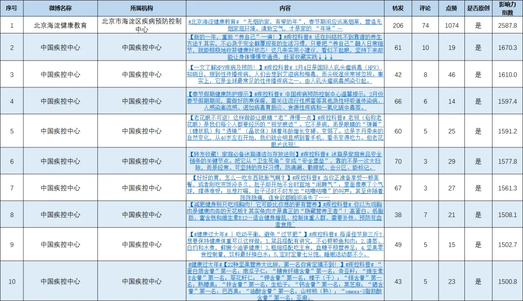 @北京海淀健康教育 发布的文章《“无烟的家,有爱的年”,春节期间应远离烟草,营造无烟家庭环境》以2587.8的影响力指数位居榜首。@中国疾控中心 发布的文章占据19个位置,其中,文章《新的一年,重新“养自己”一遍!》以1670.3的影响力指数位居第二。
