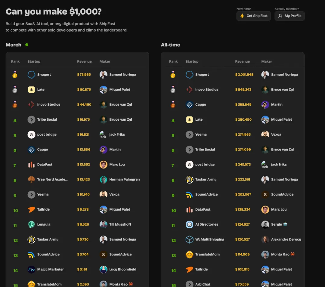 所以今天水个内容,研究一下 shipfast 的这个榜单上,这些站都在搞什么。AI 导航站那么多,但都是只给个访问量,这个是把所谓的真实收入给出来了(基于 shipfast 的权威度,应该保真)。