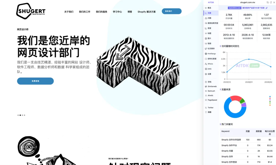 首先是总收入高达 200 万的 shugert .com .mx ,这个是一个 Shopify 专家与数据分析解决方案站,好像并没有用到 AI 来赋能,是一个传统的 SaaS 平台。
