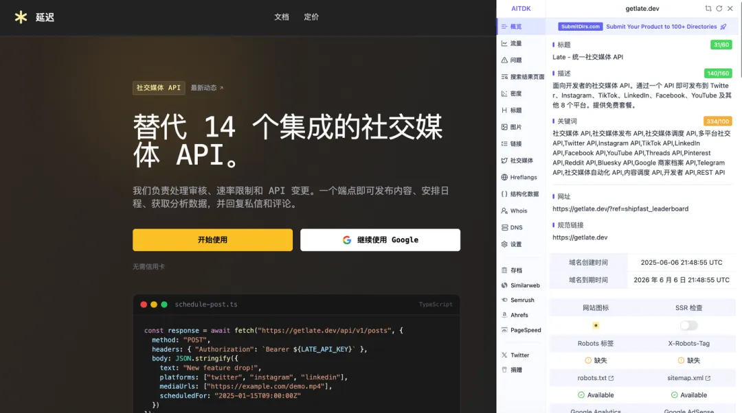 是 getlate . dev ,月收入 6 万美金,这个也不是 AI 站,而是卖 API 接口的,过一个 API 即可发布到 Twitter、Instagram、TikTok、LinkedIn、Facebook、YouTube 及其他 8 个平台。