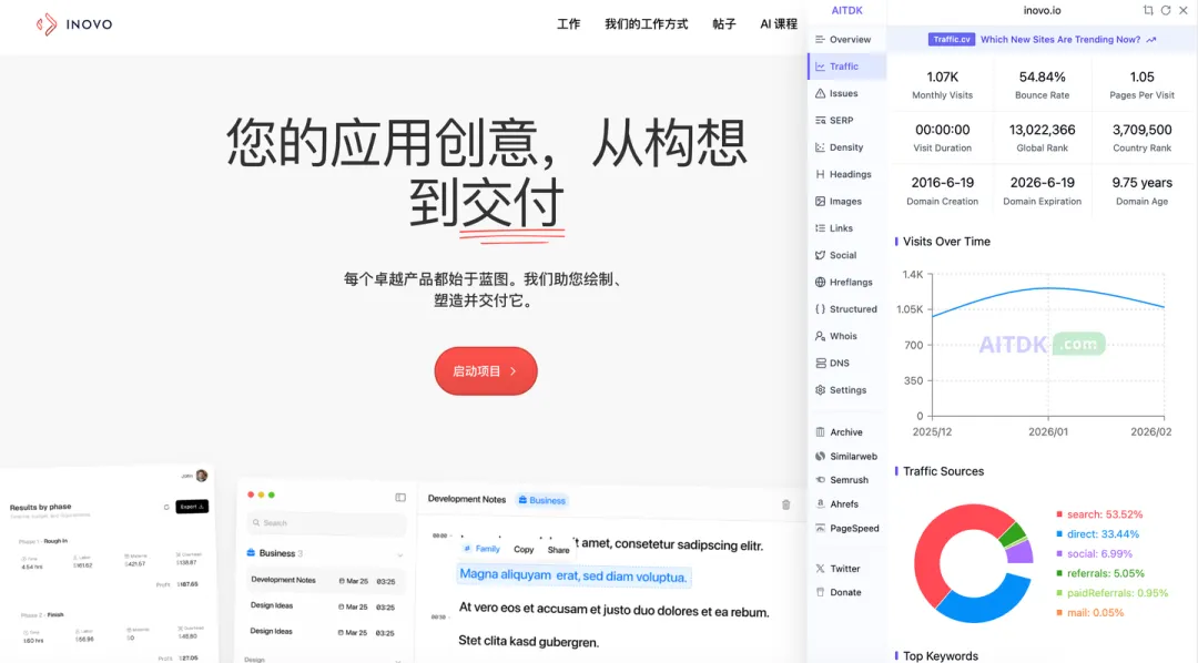 这个是月入 4.4 万的 inovo .io ,月访问量只有 1 千。是一个项目管理平台 —— 统筹项目、工时跟踪、预算监控,助力交付用的一站式站。类似于公司内网系统。