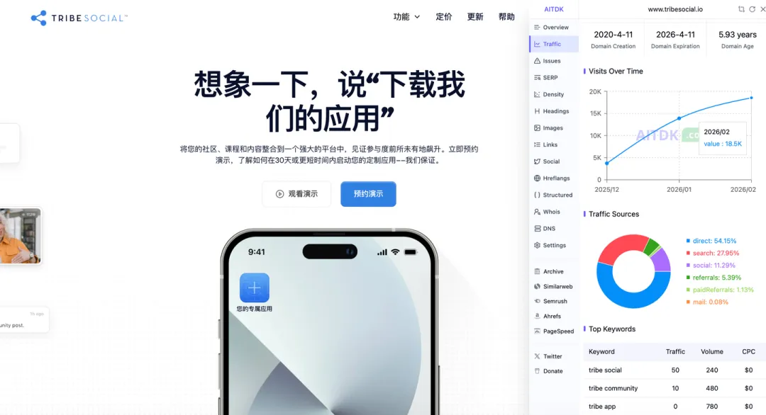 收入来源是 高价定制 + 持续服务费 模式,搜索词大都是 tribe ,说明业界是有自己的知名度的。卖点是 30 天上线 + 品牌化 + 迁移服务 ,官网上说 团队有 14+ 年定制 App 经验。这是大佬站,