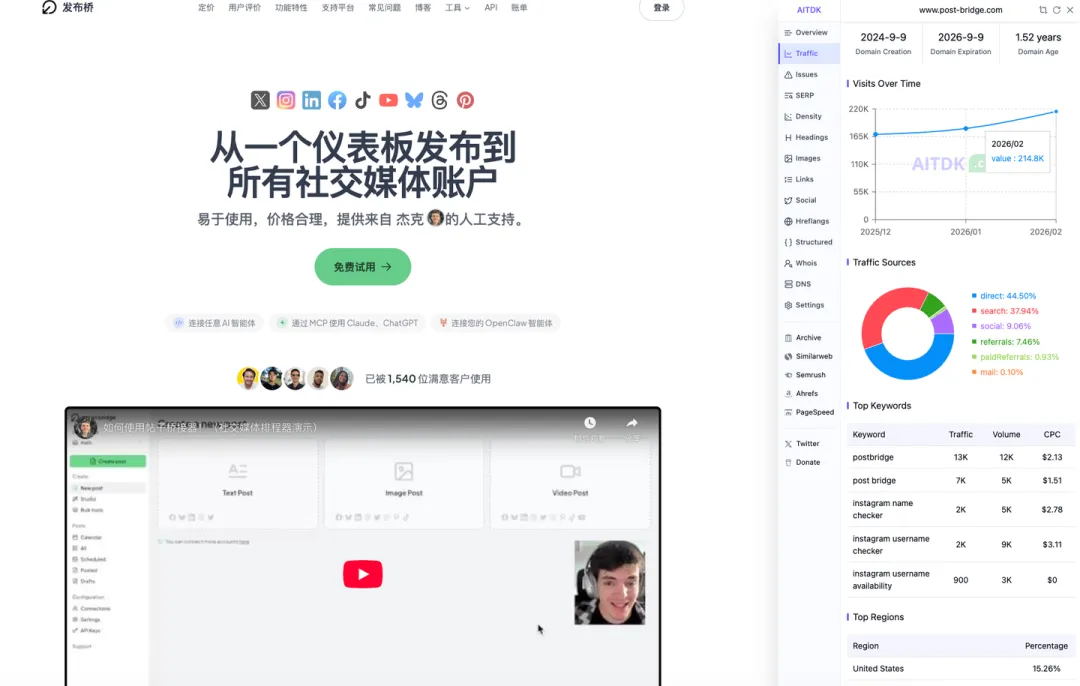 这个是月流量高达 22 万,但是月入只有 1.6w 美刀(其实也相当不错了)的 post-bridge .com ,也是一个海外的自媒体发布聚合站。