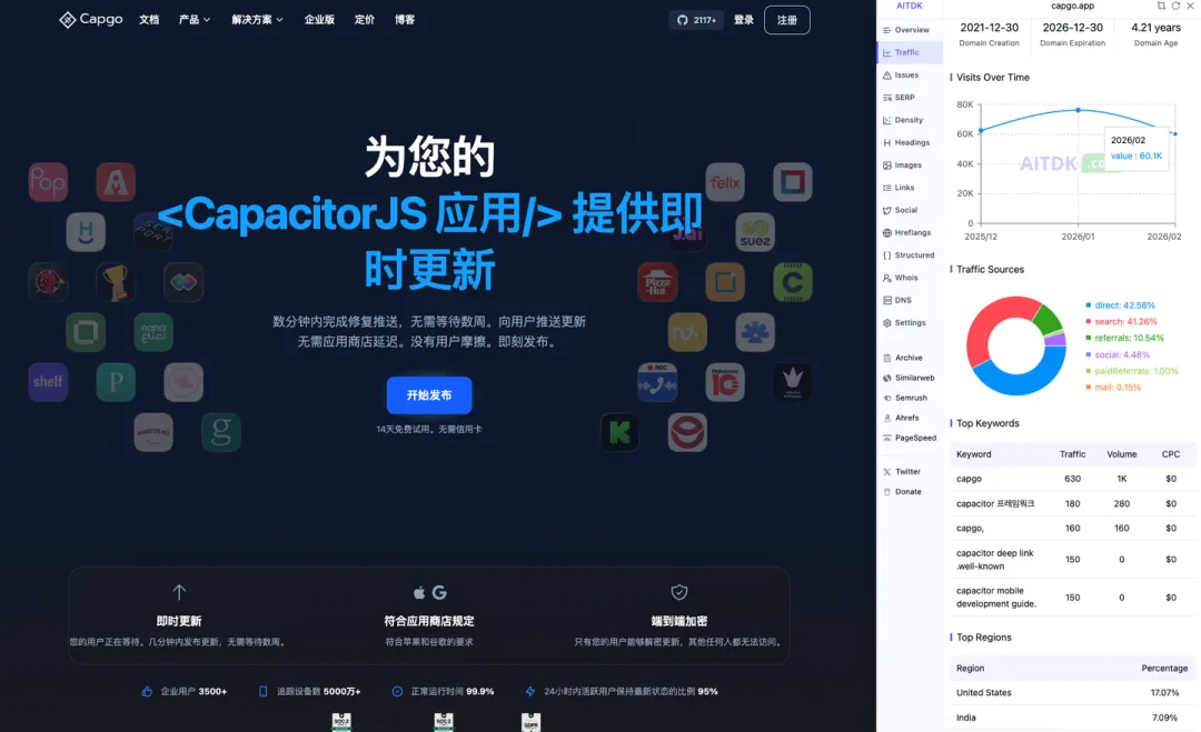 是一个技术站。月入 1.3w 美刀的 capgo .app 站。我转了一圈,其实就是解决一个痛点,就是我们开发 APP ,它不像网站,一键部署就更新了,而是需要修改,提交 APP STORE 审核,捣鼓一两天才能。