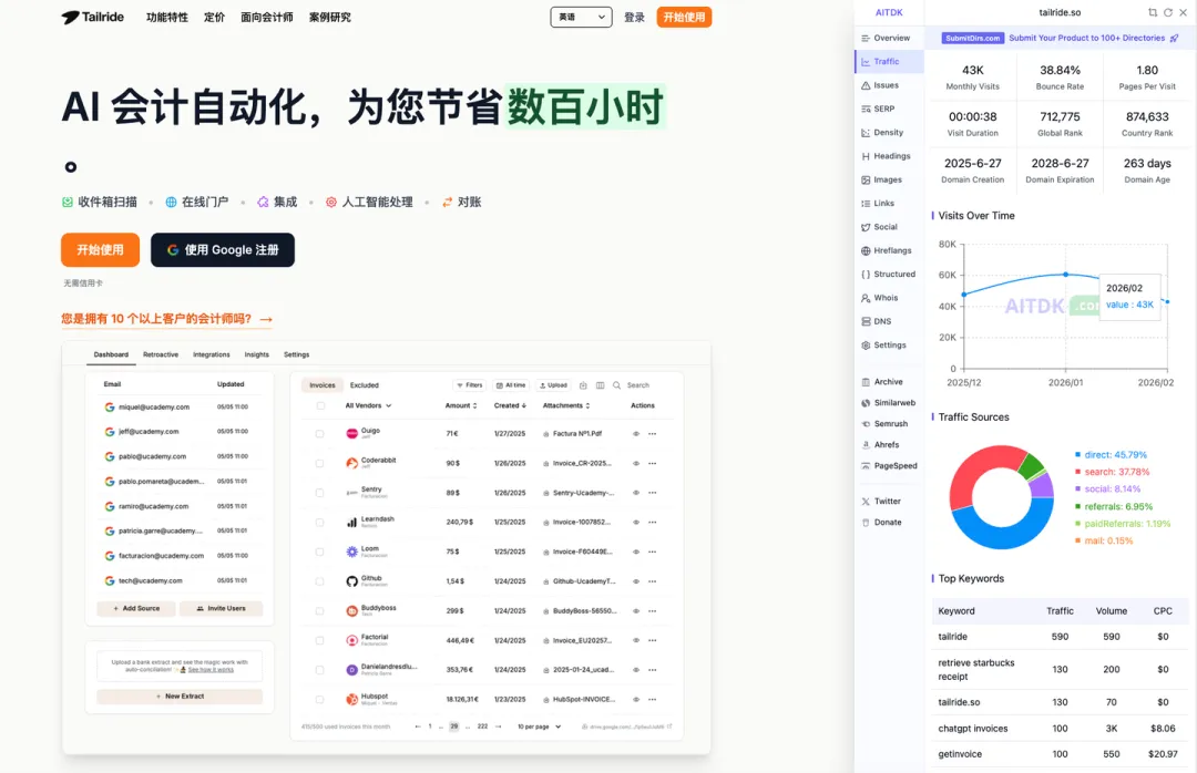 其实就是邮件监听,然后 AI 处理一下,之后对接 会计软件。随便拉个程序员,都能搞定。DR 有 41 ,看来外链建设的不错,搜索词也是正常的关键词,大家感兴趣,可以去扒扒站,很值得去「抄」哈哈 ~