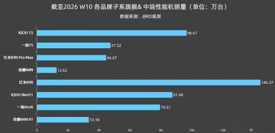 最后聊聊iQOO。旗舰第一,iQOO15销量达到96.61万,比红米K90Pro Max和一加15加起来还多。iQOO Neo11在中端排第二,销量突破87万台,两款表现还不错。