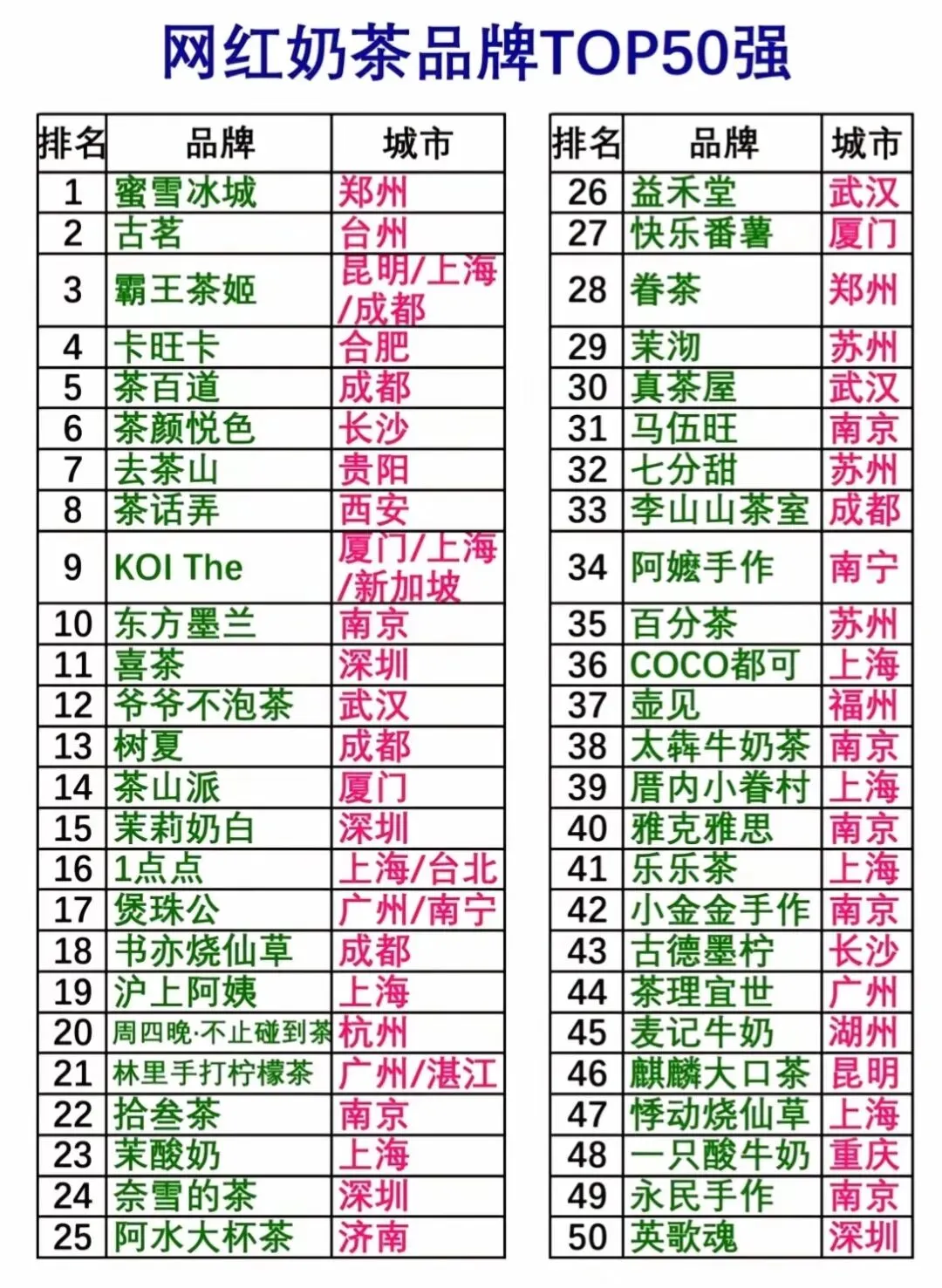 >奶茶品牌排行榜TOP50强,你最爱的那杯上榜了吗?