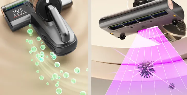 核心性能对标高端机,12000 次 / 分高频拍打深入纤维,15000Pa 大吸力瞬间吸净脏污,官方 100% 除螨率绝非噱头。杀菌双管齐下:5 颗 253.7nm UV-C 紫外线,除菌率 99.99%;搭配 DeepC 超声波空化微气泡技术,分解螨虫排泄物等顽固过敏原,真正做到深层洁净。