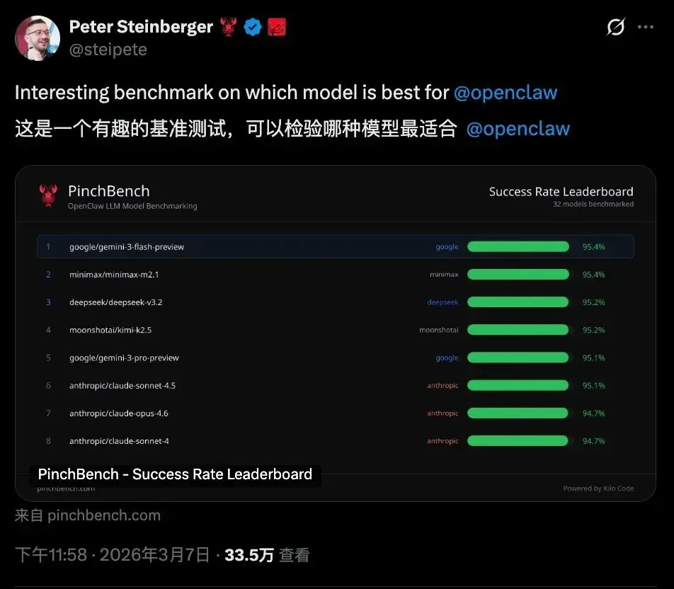 估计不少人和我一样心疼钱包,于是“龙虾”的创始人干脆搞了一场专门考试,叫 “PinchBench”。