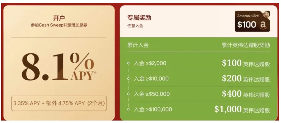 春节限时限量福利大放送:现在通过我们的专属链接注册,任意入金可以领取 $100 Amazon Gift Card。入金满足要求还可以最高获取 $1000 NVDA。闲置资金享受 8.1%APY。记得一定要通过我的链接注册入金才能拿到上述福利哦!而且额外的 $100 Amazon GC 是限量的,先到先得,名额只有 50 个!
