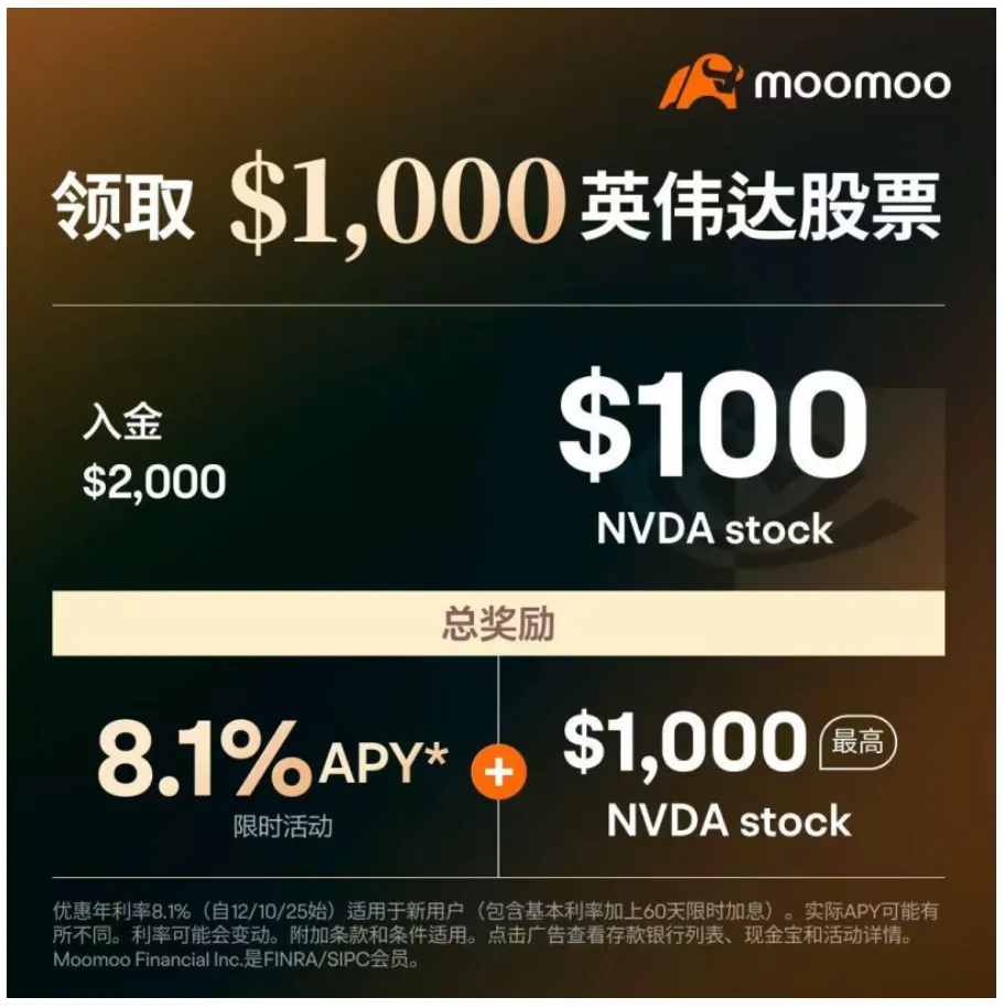 Moomoo 的开户奖励更新,入金可以领取最高 $1000NVDA,闲置资金享受 8.1%APY。不过这个月的奖励新增了锁资要求,在 60 天-180 不等 Moomoo 注册链接(开户需要 SSN/ITIN)