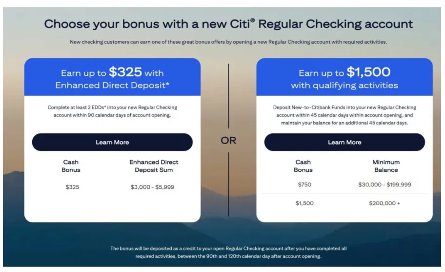 Citi 更新了一波开户奖励,现在 Checking 靠存钱最高送 $1500,而且只需要保持 45 天即可。两档的等效 APY 是 20% 、 6%。主要优势就是只需要保持 45 天,非常适合快进快出。如果有 $30k 的流动资金,弄一个非常划算。