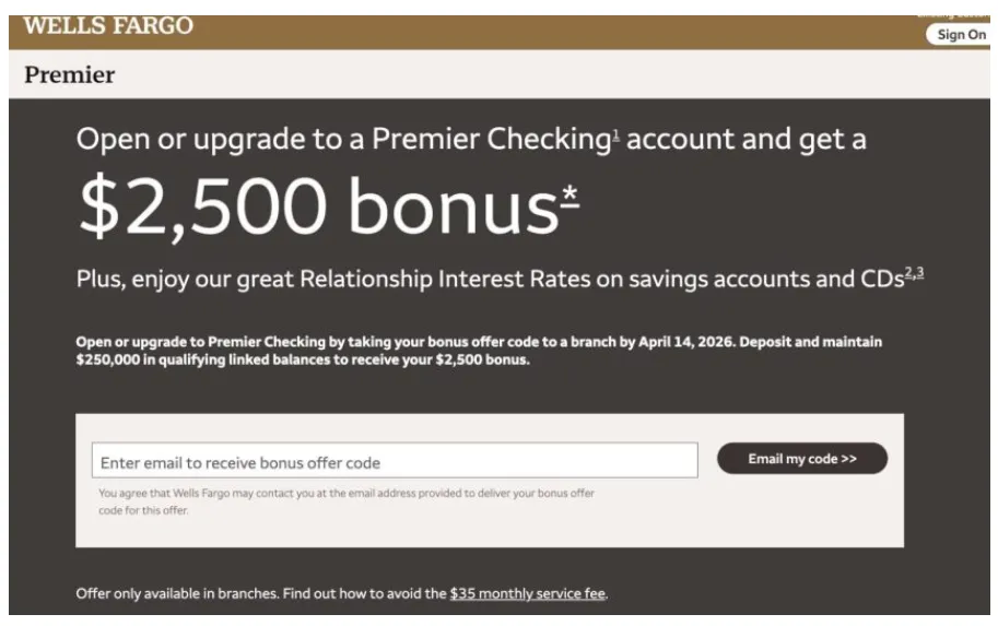 - Wells Fargo Premier $2500 offer(开户 45 天内,存入 $250k;保持 90 天)